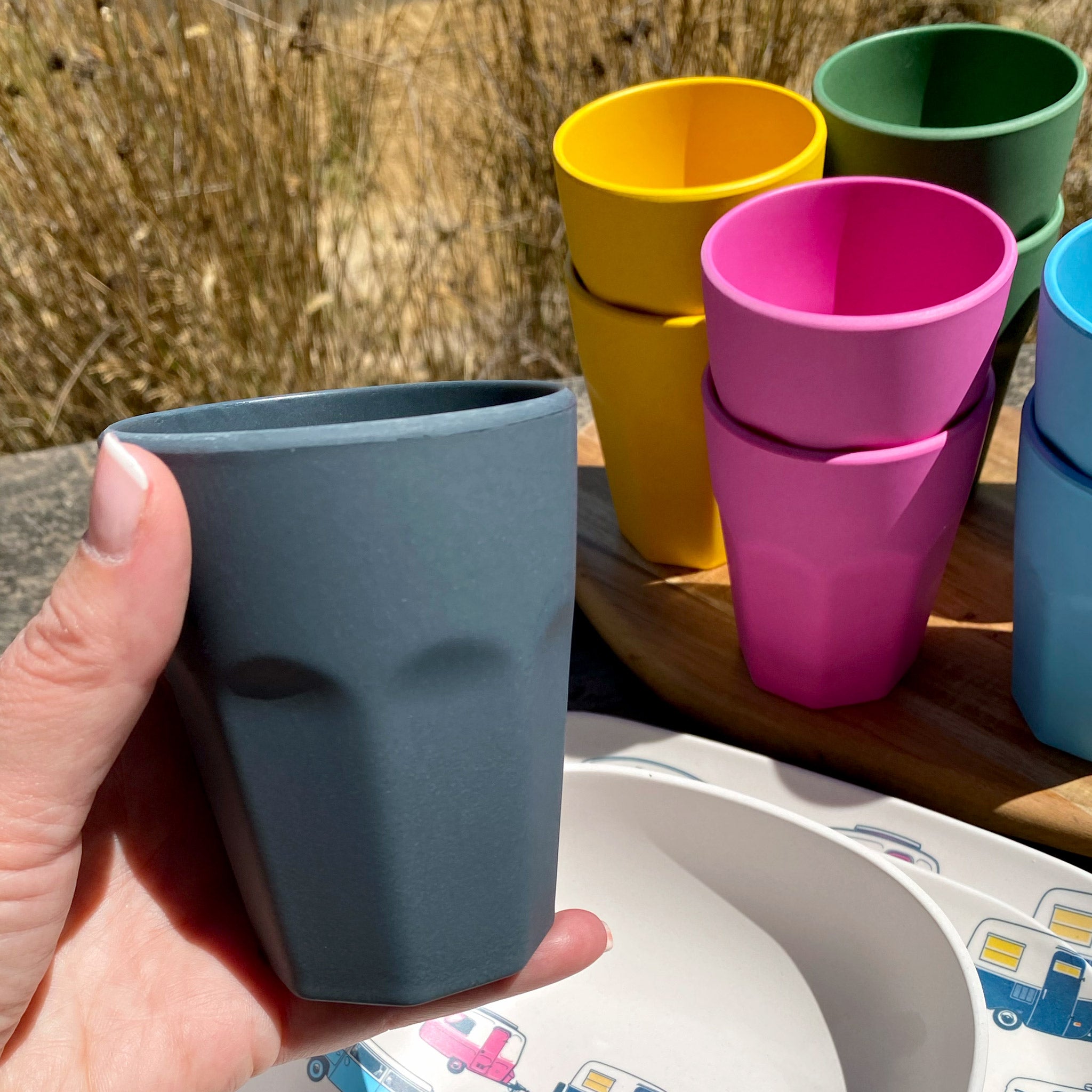 Elevate your outdoor dining with our bamboo tumblers and latte cups. Featuring hand-illustrated caravan designs or plain colours, these lightweight, durable drinkware pieces are designed to mix and match with our dinnerware, adding a touch of style and colour to your adventures.